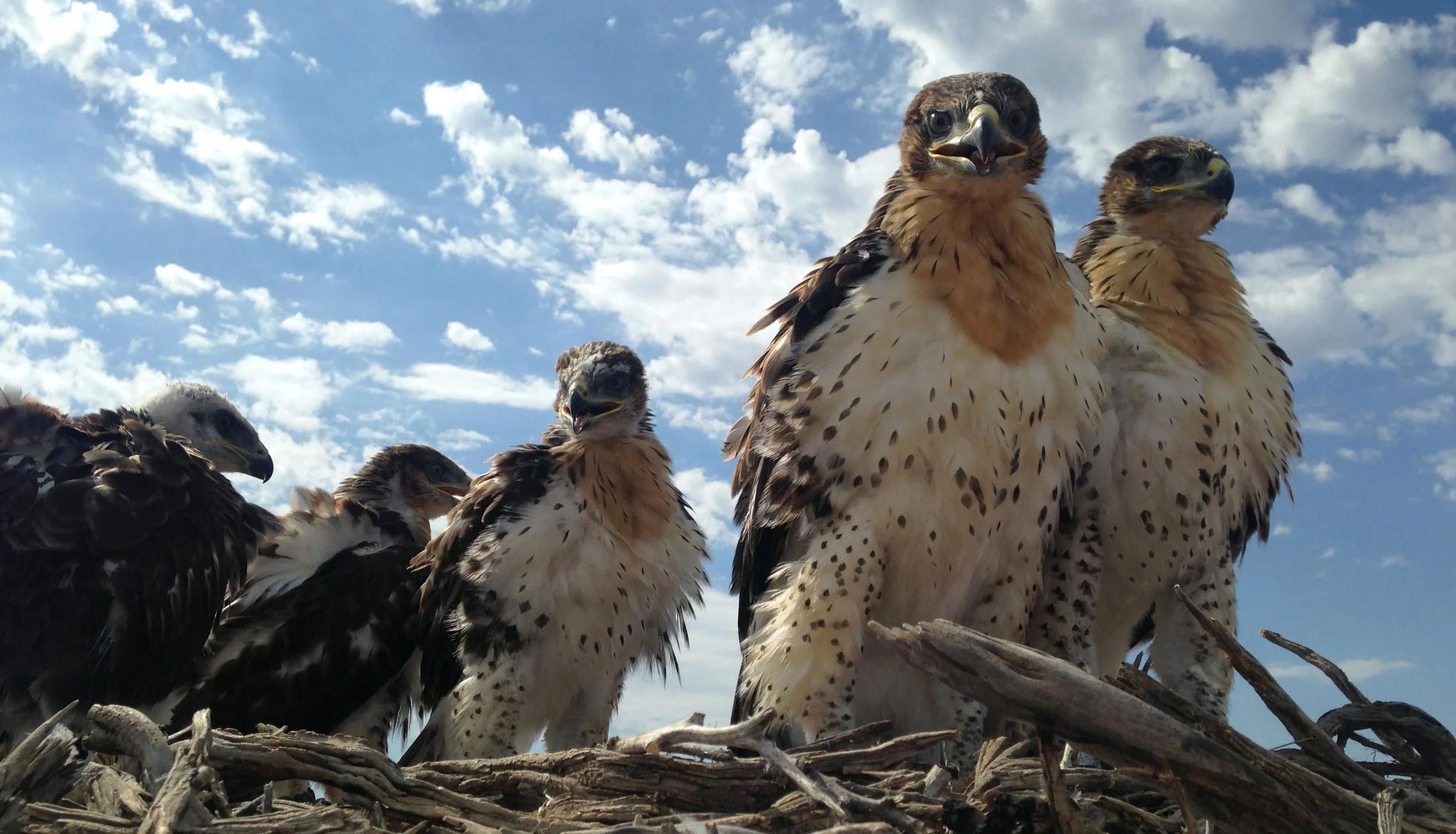 Ferruginous hawk nestlings wondering who their new visitors are just before researchers collect them for processing. The nestlings will recieve aluminum leg bands with unique identification numbers and will have several morphological measerments taken before being returned to the nest. This research is conducted with federal and state permits in place.